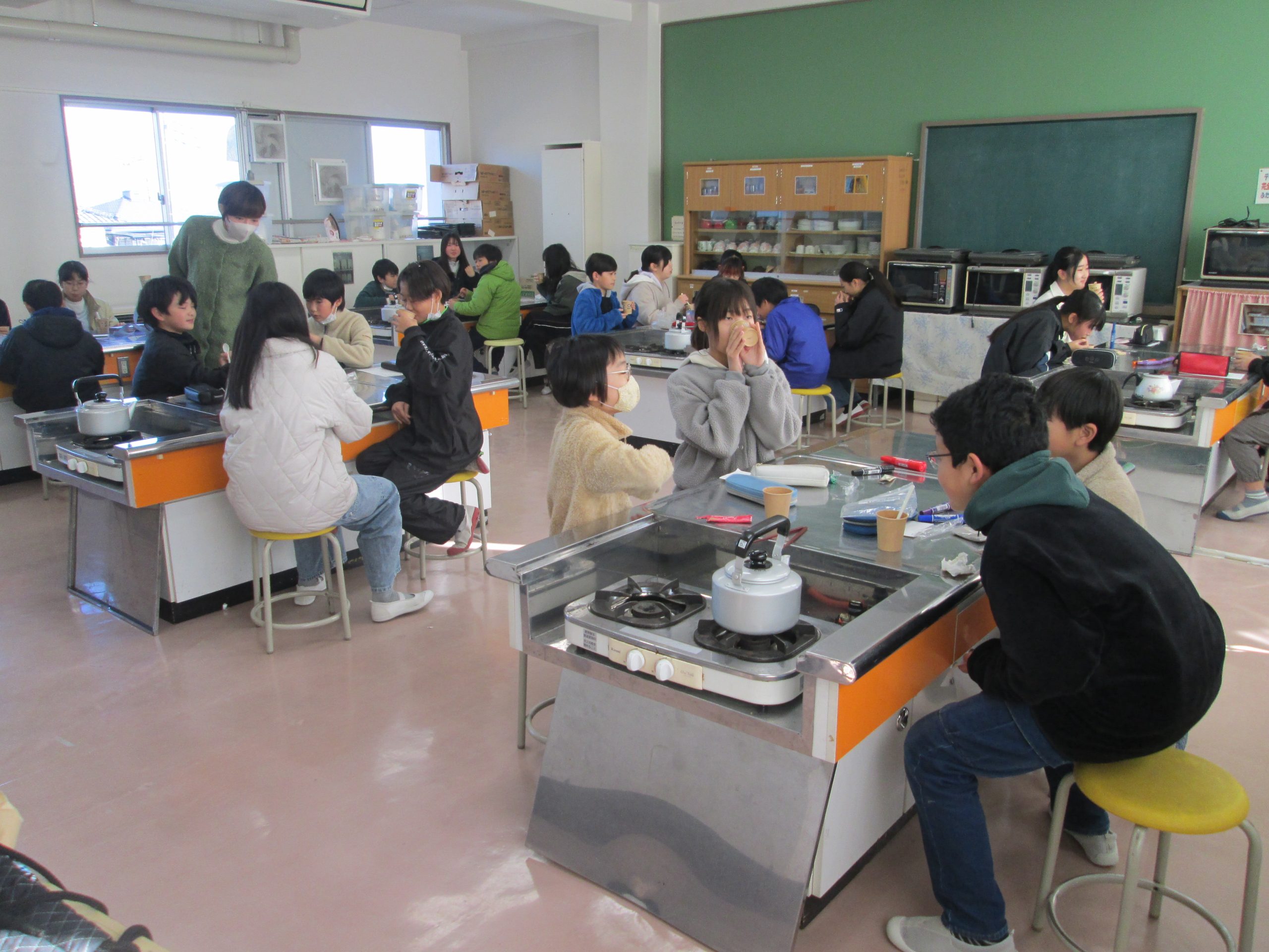 この日、6年生は家庭科室で、「ティータイム」を楽しんでいました。この活動は、理科「物の燃え方と空気」の学習で学んだことを生かした活動です。湯を沸かし、それぞれ好みの飲み物を飲みながら、忙しかった2学期の活動や日頃の様子について話し合っていました。