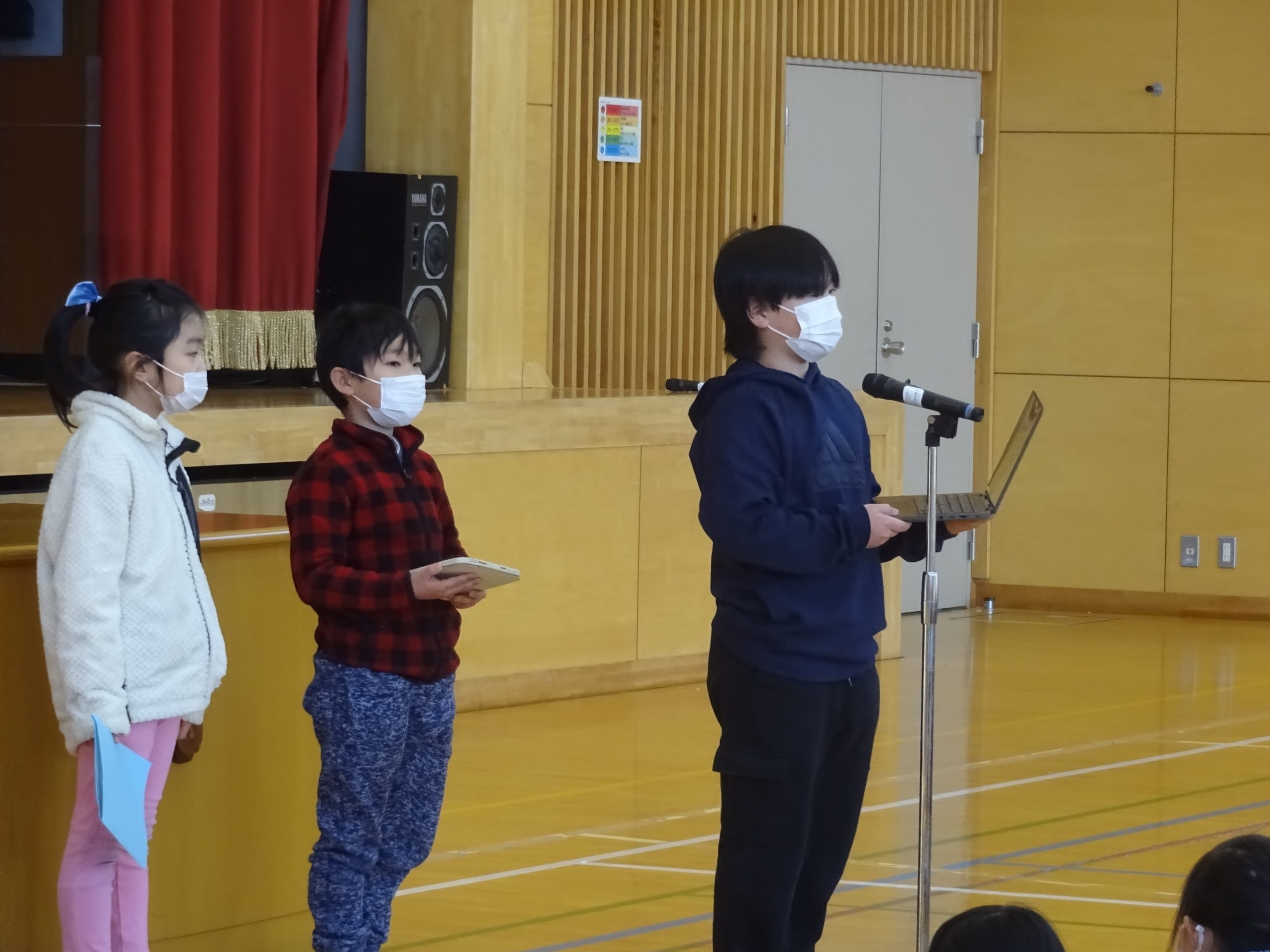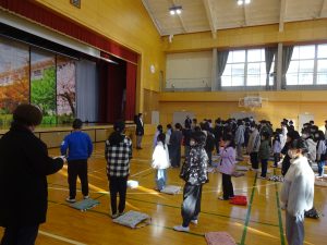 この日、体育館に全校のみんなが集まり、3学期の始業式を行いました。20分ほどの式でしたが、寒さに負けず、どの学年の子どもたちも集中して式に臨んでいました。