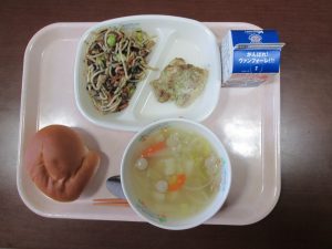 この日から、3学期の給食が始まりました。この日の献立は、ミルクパン・バジルチキン・ヒジキスパゲッティ・ポトフ・牛乳でした。