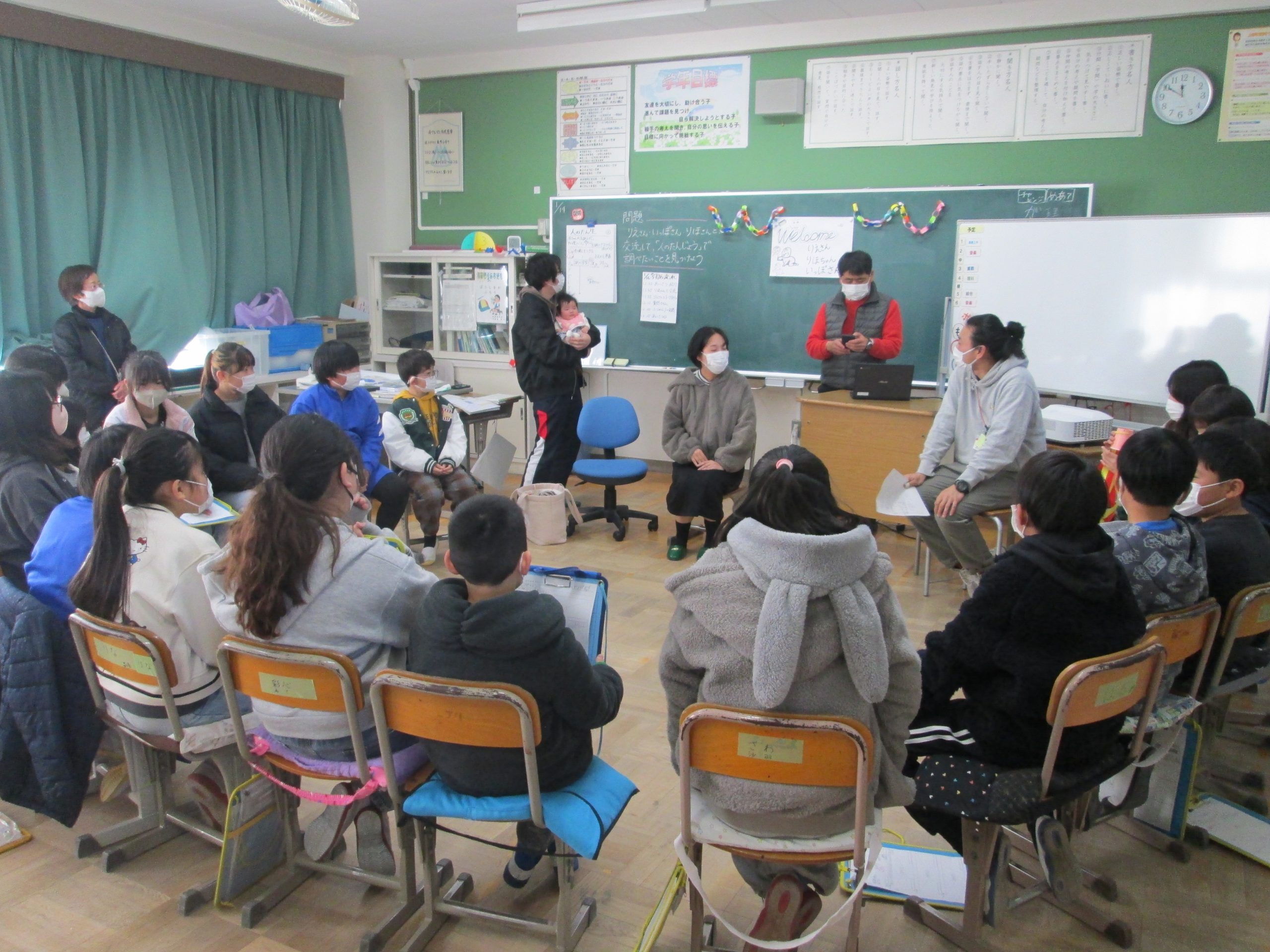 この日の4校時、5年生は理科「人の誕生」の学習の一環として、実際に生まれたばかりの赤ちゃんと接したり、その父母から出産時の様子を聞いたりする活動を行いました。