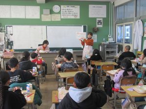 この日の給食の時間、栄養教諭が各クラスを回り、給食指導を行いました。今回は、「牛乳」のよいところについて、説明しました。牛乳は栄養バランスがよいので、感染症等の予防にも強い味方になるでしょう。