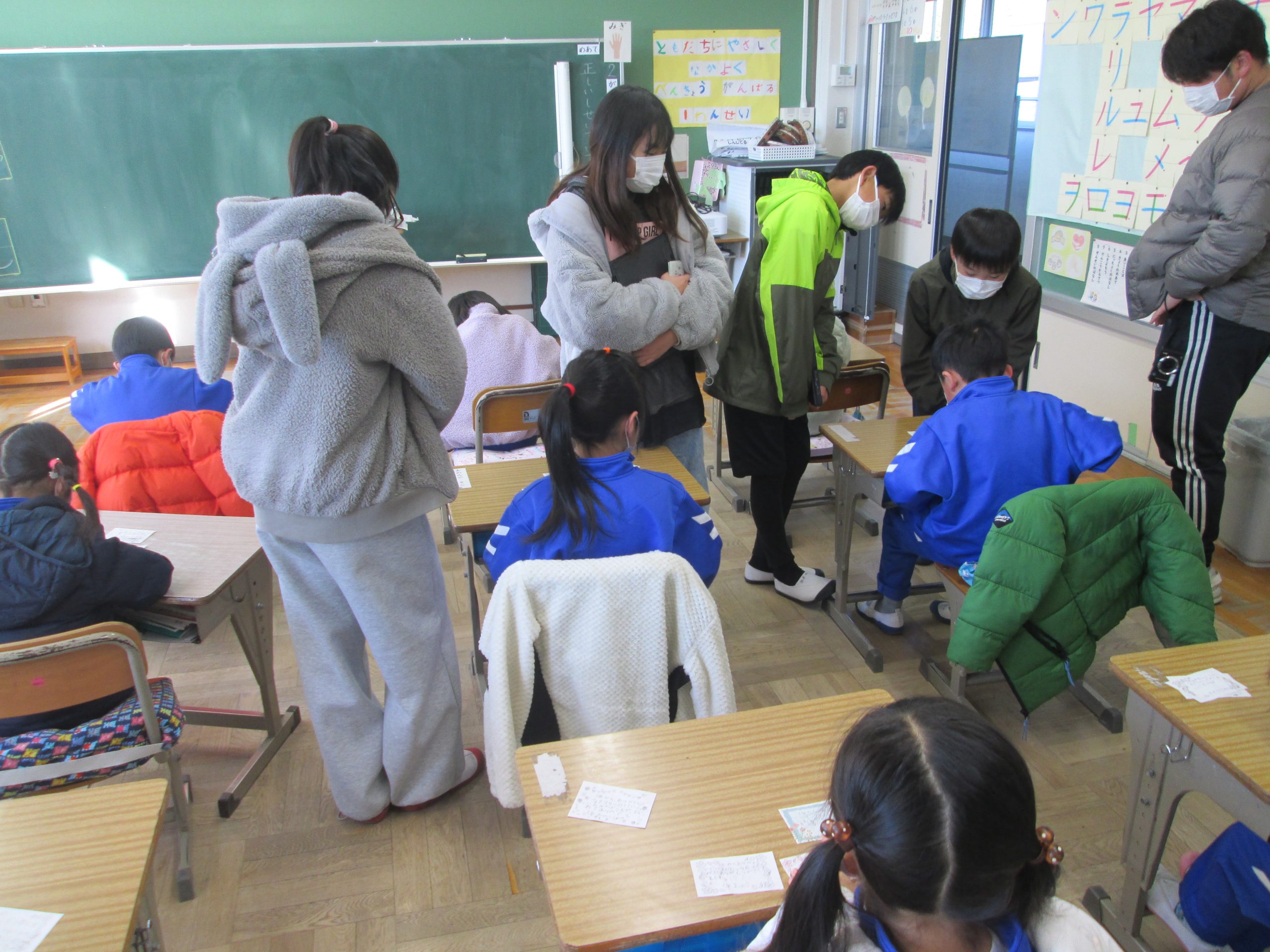 新児童会が中心となり、今月下旬に行う「6年生を送る会」へ向けての準備が進められています。この日の朝、5年生が1年から3年の各教室に行き、6年生に贈るメッセージ作成について、説明・指導していました。