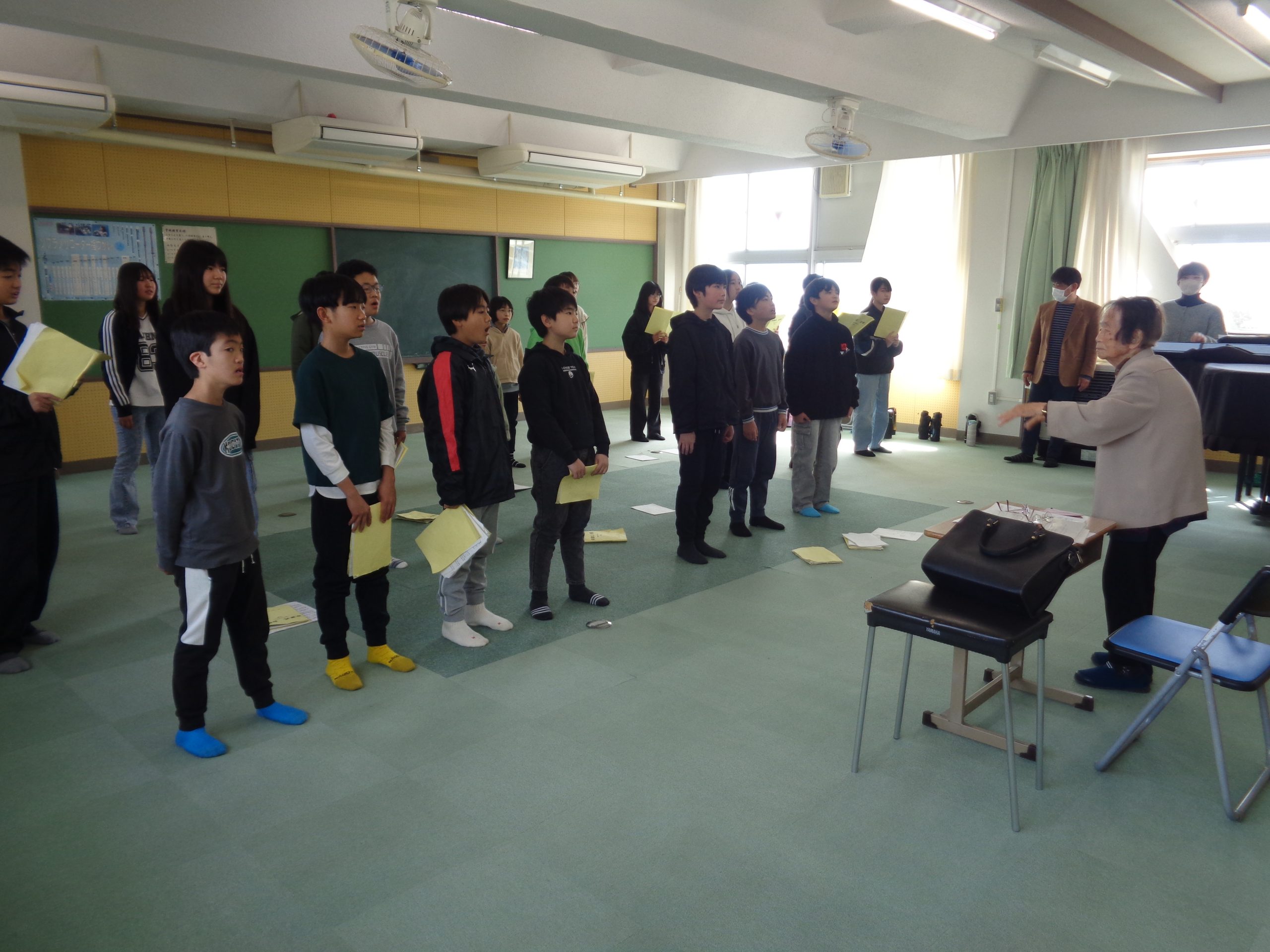 本校は長年、埴原美恵子先生に合唱の指導をお願いしています。この日の午前中には、卒業式に向けて6年生が指導を受けました。